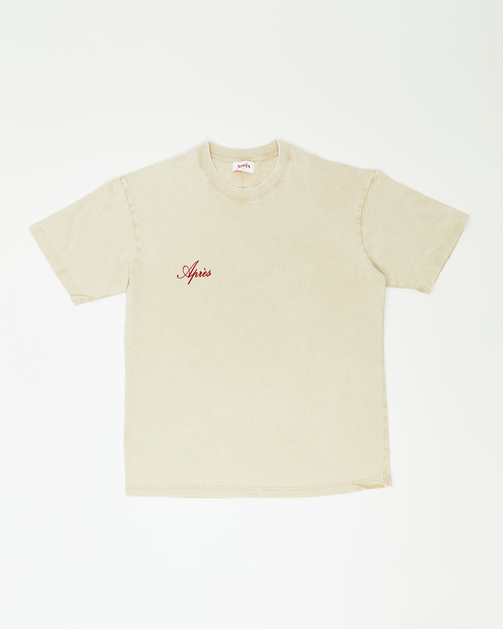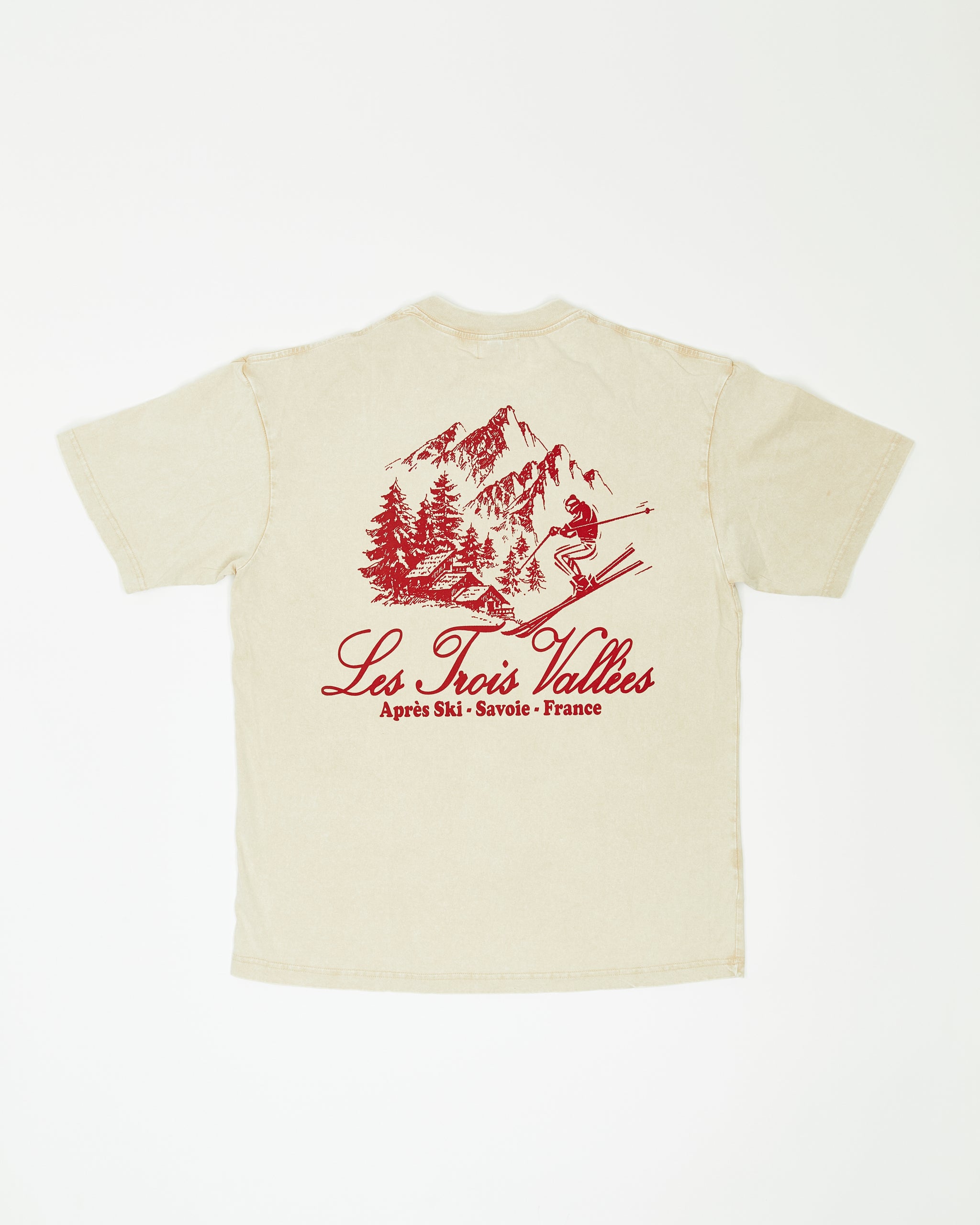 A cream white vintage-wash crewneck tee, featuring our reimagined italic Après logo on the right chest and a bold Les Trois Vallées back print. A nod to the French roots of Après Ski culture, this limited edition drop includes only 50 tees. Slightly oversized fit, made to be worn on and off the slopes.
